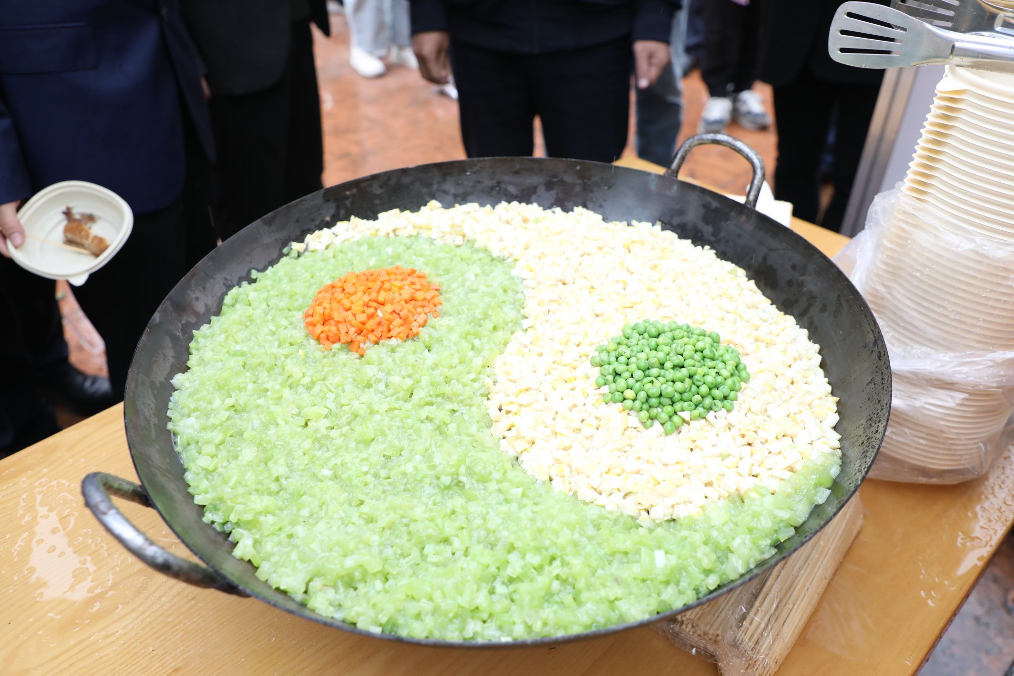 這是一口直徑達1.5米的超級大鐵鍋,鍋內是近千斤野筍、筍干、毛筍衣、雷筍、毛筍和各地竹筍烹飪而成的6道竹筍菜。隨著鍋蓋正式開啟,騰騰熱氣散發著濃郁的鮮香和春天的味道,引得排隊的師生垂涎欲滴。