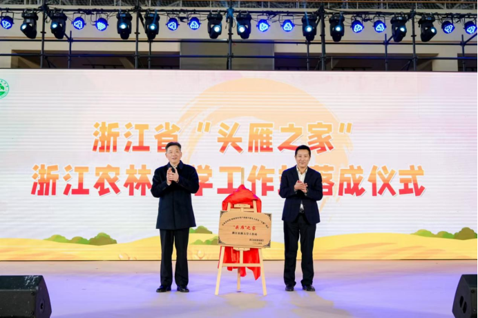 開幕式上,穿越時空的“美食家”--北宋文豪“蘇東坡”重游臨安,并帶來精彩的“頭雁興農夢”舞臺劇,用古今結合的方式生動展現了鄉村蝶變的壯麗畫卷。由我校“頭雁”“鄉村CEO”學員們發起的“興農基金”正式成立,并舉行了現場捐贈儀式。浙江省“頭雁之家”浙江農林大學工作站落成儀式舉行,并對11個地市區“頭雁之家”工作分站進行了授牌。2024年浙江“千萬工程”講解員比武大賽一等獎獲得者方泳還進行案例分享,講述了他在“新宇村”的致富之路,贏得了現場觀眾的陣陣掌聲。