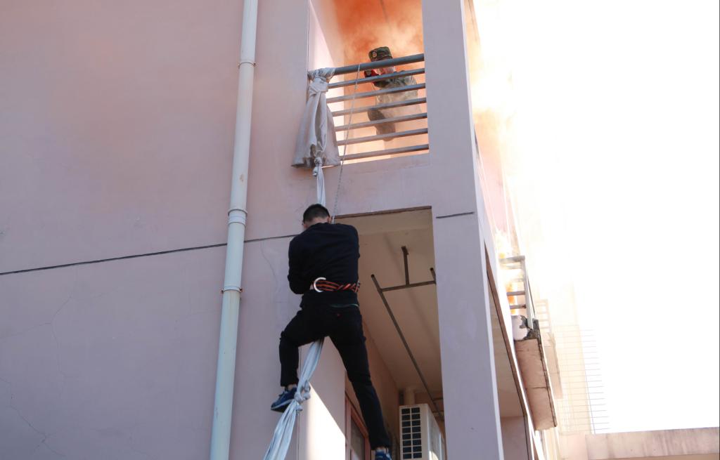 消防滅火救援演練開始。A3、A4學(xué)生公寓濃煙四起,學(xué)生發(fā)現(xiàn)火情后,緊急呼救,公寓管理員立即撥打“校園110”報(bào)警并發(fā)出火警信號(hào),指揮中心接警后,迅速啟動(dòng)浙江農(nóng)林大學(xué)突發(fā)事件應(yīng)急處置預(yù)案,指揮應(yīng)急隊(duì)員及校衛(wèi)隊(duì)員趕赴“火災(zāi)現(xiàn)場(chǎng)”開展滅火、警戒和人員疏散。樓宇疏散引導(dǎo)員指揮被困學(xué)生用濕毛巾捂住口、鼻,單列、靠右沿樓道有序撤離。第一梯隊(duì)學(xué)生公寓志愿消防員火速達(dá)到現(xiàn)場(chǎng)施救,隨后,第二梯隊(duì)微型消防站消防隊(duì)員、志愿消防隊(duì)員緊急到達(dá)火災(zāi)現(xiàn)場(chǎng)救援。臨安區(qū)消防大隊(duì)接警后,出動(dòng)應(yīng)急救援車、消防車等多輛消防車和30余名消防官兵,及時(shí)趕到現(xiàn)場(chǎng)救援,消防官兵充分運(yùn)用高空云梯、竹梯、氣墊、高空緩降等方式,施救被困人員,待人員有序撤離后,迅速撲滅火患。