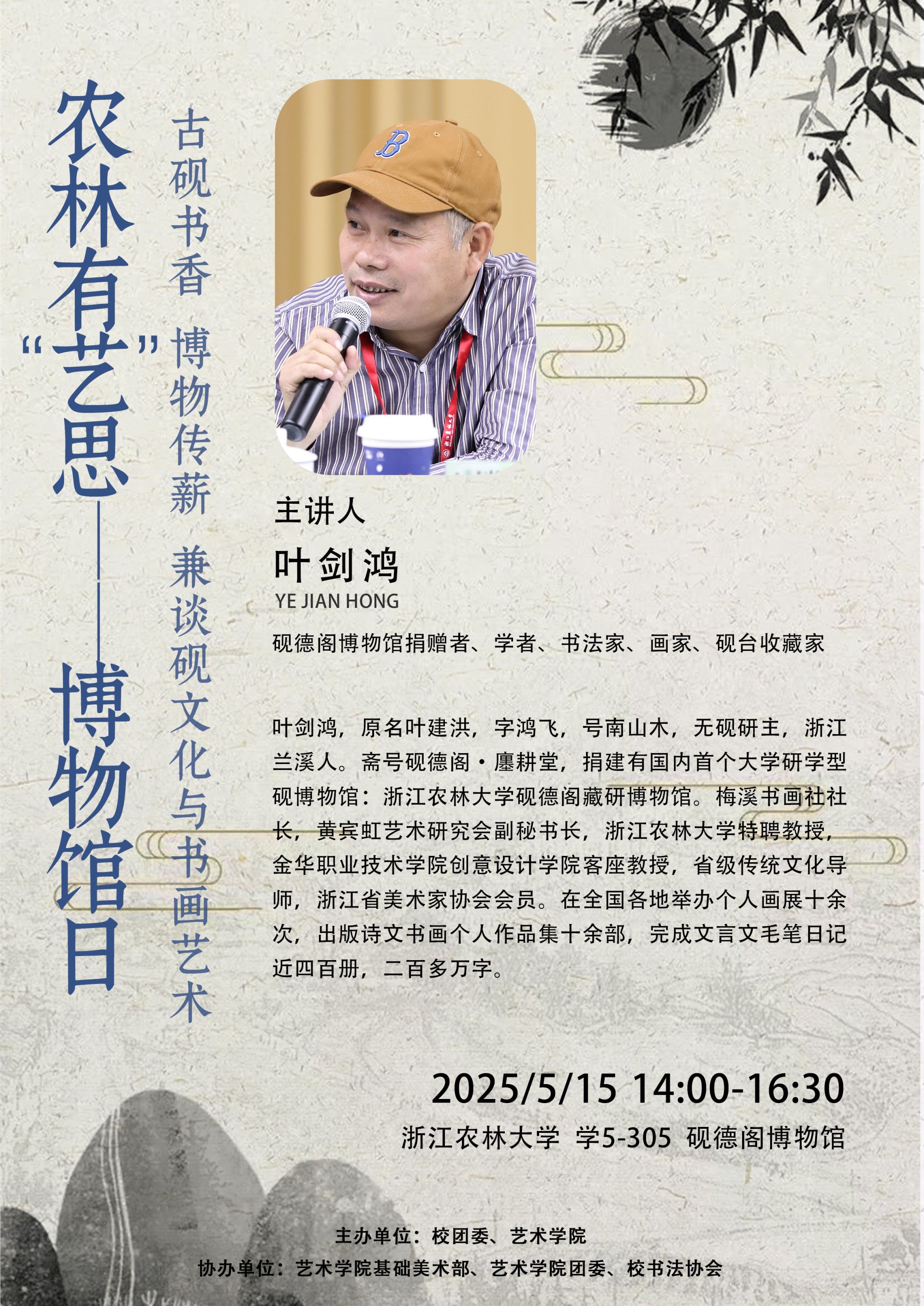 主講人簡介:葉劍鴻,原名葉建洪,字鴻飛,號南山木,無硯研主,浙江蘭溪人。齋號硯德閣·廛耕堂,捐建有國內首個大學研學型硯博物館:浙江農林大學硯德閣藏研博物館。梅溪書畫社社長,黃賓虹藝術研究會副秘書長,浙江農林大學特聘教授,金華職業技術學院創意設計學院客座教授,省級傳統文化導師,浙江省美術家協會會員。在全國各地舉辦個人畫展十余次,出版詩文書畫個人作品集十余部,完成文言文毛筆日記近四百冊,二百多萬字。