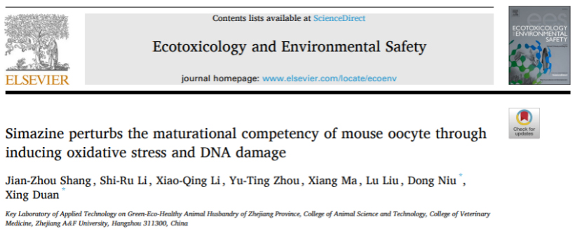 1月15日,段星教授團隊指導動物科學2018級本科生尚建洲在國際知名期刊Ecotoxicology and Environmental Safety(中科院二區Top,IF: 7.129)發表題為“Simazine perturbs the maturational competency of mouse oocyte through inducing oxidative stress and DNA damage”的研究論文。