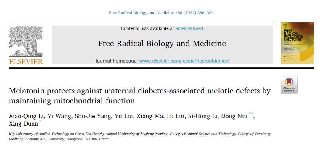 7月1日,段星教授團隊指導研究生李曉慶在國際知名醫學期刊Free Radical Biology and Medicine(中科院二區Top,IF: 8.101)發表題為“Melatonin protects against maternal diabetes-associated meiotic defects by maintaining mitochondrial function”的研究論文。