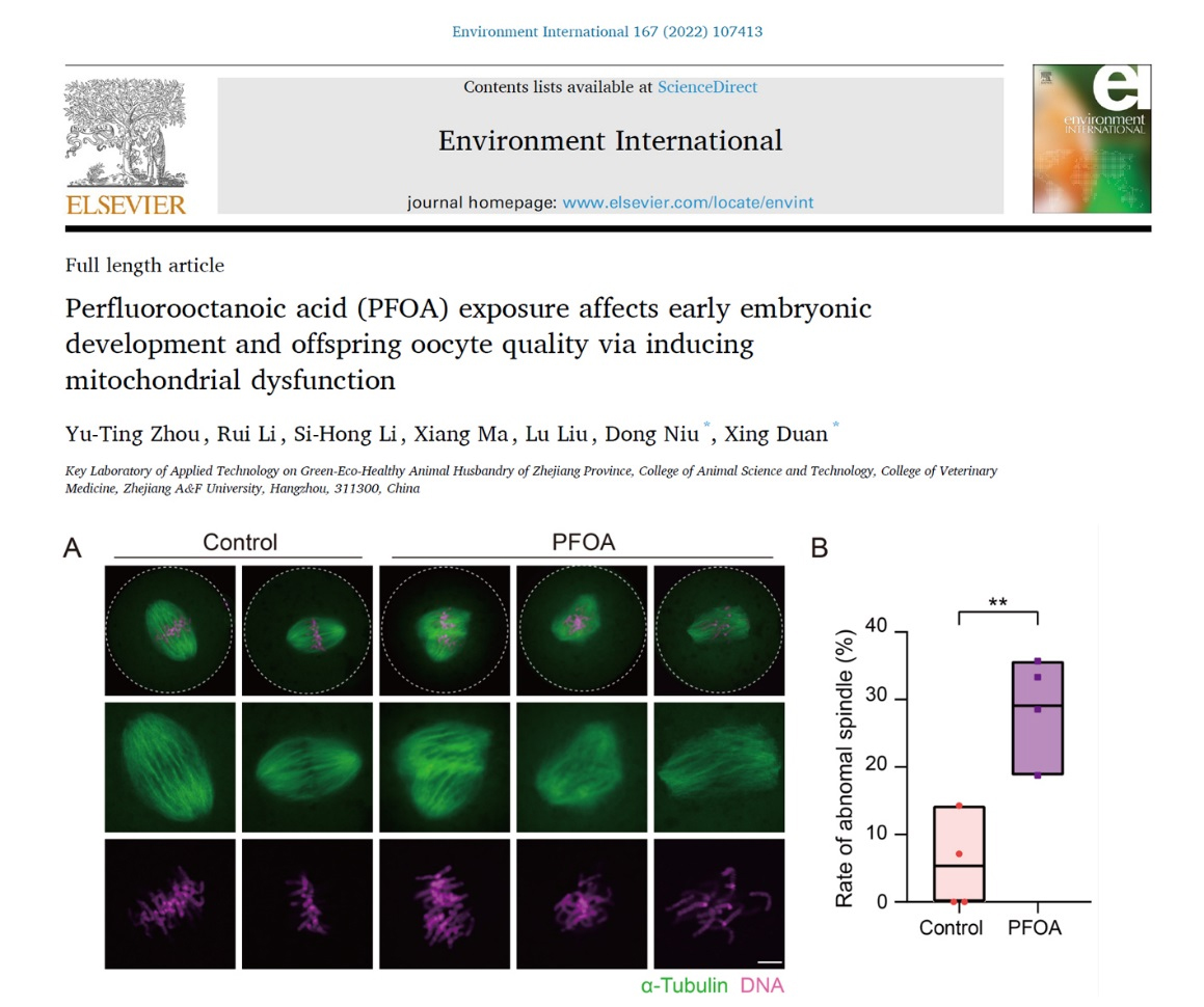 7月18日,動科動醫學院段星、牛冬教授團隊指導動物科學2019級本科生周雨亭在國際知名期刊Environment International(中科院一區,IF: 13.352)在線發表題目為Perfluorooctanoic acid (PFOA) exposure affects early embryonic development and offspring oocyte quality via inducing mitochondrial dysfunction” 的研究論文。該研究系統闡述了全氟辛酸(PFOA)對雌性動物早期胚胎發育及子代卵巢功能的影響及作用機制,為解決環境內分泌干擾物影響雌性動物生殖健康提供了重要理論依據。