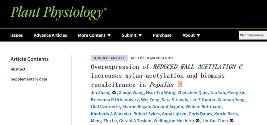 近日,國家重點實驗室林木木材品質研究團隊張進教授在植物學領域著名期刊《Plant Physiology》在線發表了題為Overexpression ofREDUCED WALL ACETYLATION Cincreases xylan acetylation and biomass recalcitrance inPopulus的研究論文。該研究揭示了細胞壁木聚糖乙酰化影響楊樹生物質能源轉化效率的新機制。