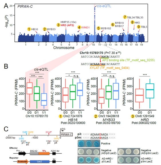 A.eQTL分析發現PtRWA-C基因在木質部的表達受強烈的cis-eQTL和trans-eQTL調控;B.cis-eQTL和trans-eQTL在不同基因型之間對PtRWA-C基因表達的影響;C.利用酵母單雜明確轉錄因子HRD對PtRWA-C的調控依賴于cis-eQTL的關鍵位點