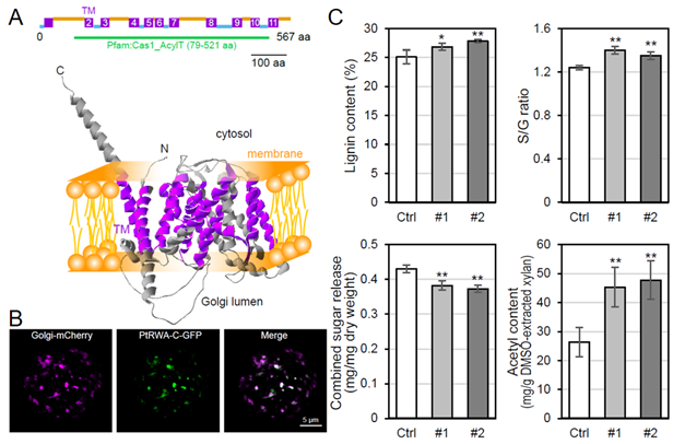 A.PtRWA-C蛋白結構預測;B.PtRWA-C蛋白定位于高爾基體上;C.過表達PtRWA-C基因導致楊樹細胞壁木聚糖乙酰化水平升高、木質素含量及木質素單體S/G比率升高、細胞壁糖釋放效率降低