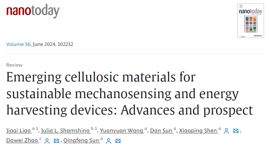 3月14日,林業工程學科生物質仿生智能研究團隊在材料科學領域國際期刊《Nano Today》(中科院1區,IF=17.4)在線發表題為《用于可持續機械傳感和能量收集裝置的新興纖維素材料:進展與前景》(Emerging cellulosic materials for sustainable mechanosensing and energy harvesting devices: Advances and prospect)的綜述論文。第一作者是該團隊碩士研究生廖嘉棋,通訊作者為浙江農林大學沈曉萍副教授和孫慶豐教授,合作作者包括美國得克薩斯理工大學Julia L. Shamshina助理教授和沈陽化工大學趙大偉教授。浙江農林大學化學與材料工程學院為該論文第一單位和通訊作者單位。