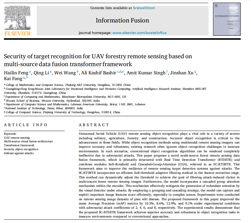 近日,浙江農林大學數學與計算機科學學院馮海林教授團隊論文《Security of target recognition for UAV forestry remote sensing based on multi-source data fusion transformer framework》(基于多源數據融合transformer框架的無人機林業遙感目標識別安全性研究)在《Information Fusion》期刊發表。《Information Fusion》為中科院一區期刊,影響因子18.6,在“Computer Science: Artificial Intelligence”(計算機:人工智能)學科146個期刊中排名第3,在“Computer Science: Theory & Methods”(計算機:理論&方法)學科110個期刊中排名第2,是人工智能領域與計算機科學的國際頂尖權威刊物,聚焦于信息融合、數據融合、知識融合等領域的研究。