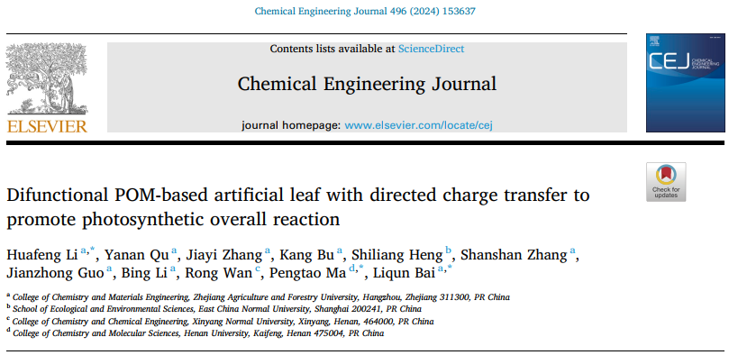 近日,化材學院生物質能源材料研究團隊在國際知名期刊《Chemical Engineering Journal》(中科院1區Top,IF=13.3)發表題為“Difunctional POM-based artificial leaf with directed charge transfer to promote photosynthetic overall reaction”的研究論文。浙江農林大學為第一通訊單位,化材學院青年教師李華豐博士、白麗群教授和河南大學馬鵬濤教授為通訊作者。