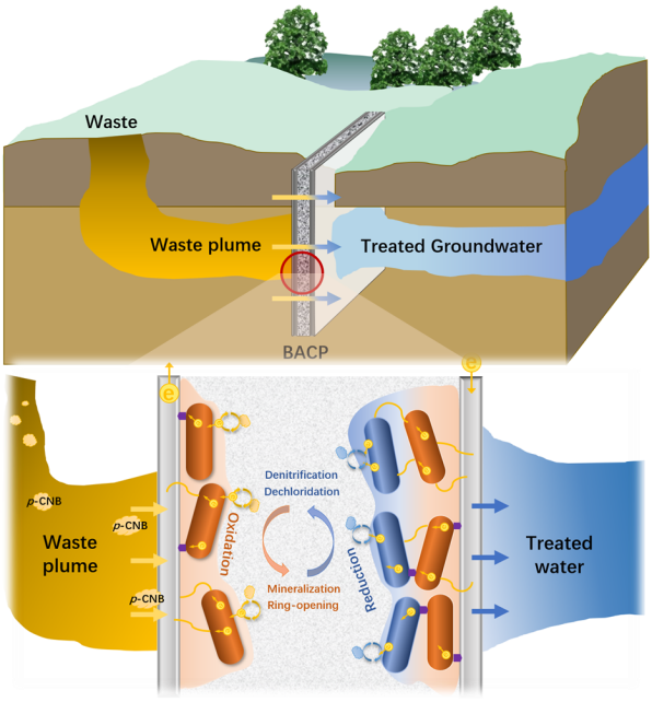對氯硝基苯(p-CNB)是一種用于生產殺蟲劑、除草劑、染料和各種工業化學品的重要合成中間體,會引起高鐵血紅蛋白血癥、溶血性貧血、肝病和神經損傷等疾病,在地下水中被廣泛檢測到。例如Fenton等傳統處理工藝,處理地下水中p-CNB通常存在修復成本高、二次污染重、環境風險大等問題。滲透性反應屏障(PRB)是一種地下水污染物修復的主流技術,但因它容量有限,無法持續去除污染物。生物電化學系統(BES)是一種以清潔電能作為驅動力,強化微生物氧化或還原有機污染物的新興生物處理技術,特別是對于類似p-CNB等需要協同還原-氧化作用才能降解的污染物具有很好的去除性能。
