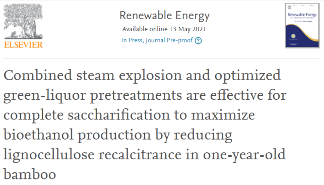 近日,國家重點實驗室竹子研究團隊與華中農業大學生物質能團隊等合作,在能源領域國際知名期刊《Renewable Energy》(IF=6.274),在線發表了最新研究成果“Combined steam explosion and optimized green-liquor pretreatments are effective for complete saccharification to maximize bioethanol production by reducing lignocellulose recalcitrance in one-year-old bamboo”。該研究以不同年齡的竹材為材料,結合兩步“綠色”預處理,發現1年生竹材(實際年齡僅2個月)能夠在較溫和的條件下完全降解,為竹細胞壁的綜合利用提供了技術支持。