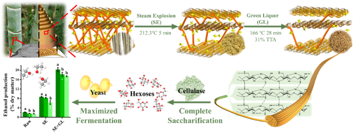 該研究通過分析不同年齡毛竹樣品細胞壁結構的差異,先進行蒸汽爆破預處理(SE),再通過響應面優化綠液預處理(GL)條件,結果發現結合兩步預處理方式能夠有效地去除木質素和半纖維素,去除率分別達到86%和77%;研究表明通過汽爆預處理能夠先去除大部分半纖維素,綠液預處理進一步去除木質素,最終導致纖維素的聚合度下降,半纖維素分支度(Xyl/Ara)增加,纖維素可及性增加,乙醇產率達到20.3%(%干物重)。該研究通過闡明蒸汽爆破和最佳綠液預處理組合顯著改良木質纖維素,來闡明為什么在1年生竹材中可以獲得最大的生物乙醇產量,為竹子等富含木質素的生物能源植物提供了一種高效的生物質加工技術,并為竹林的超短輪伐經營提供了技術支撐。